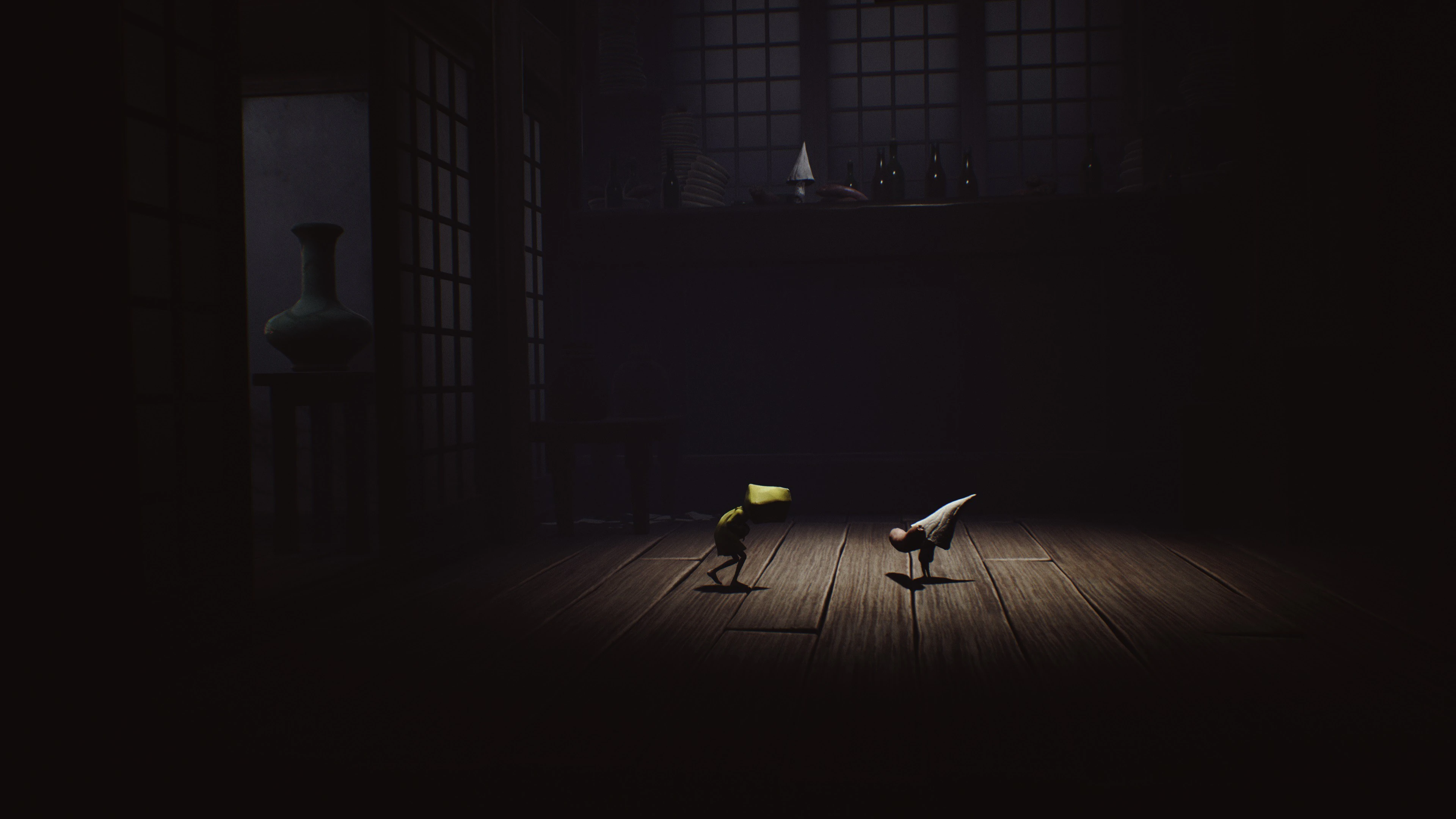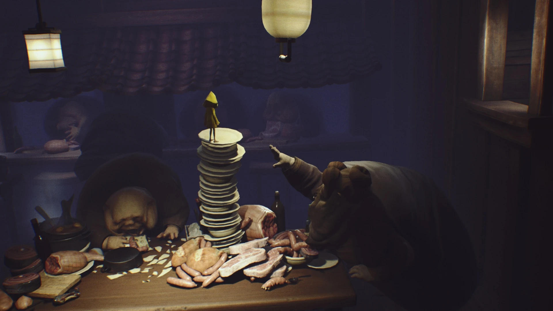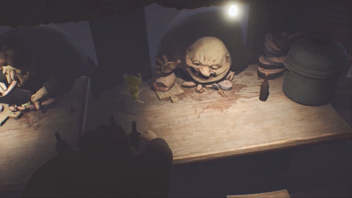 В следующей комнате будет стоять длинный стол, вдоль которого расселись в ряд ещё больше Гостей. Единственный способ продолжить путь — это забраться на стол с помощью пустующего стула в конце комнаты. Гости обратят внимание на Шестую, и будут пытаться её схватить, если она подойдёт к ним слишком близко. Чтобы не быть съеденной, девочка должна пробежать через весь стол, уворачиваясь от массивных рук Гостей. Добравшись до левой стороны стола, Шестая должна забраться на деревянные ящики, прыгнуть и ухватиться за деревянную решётку на стене. По ней можно подняться на следующий этаж.