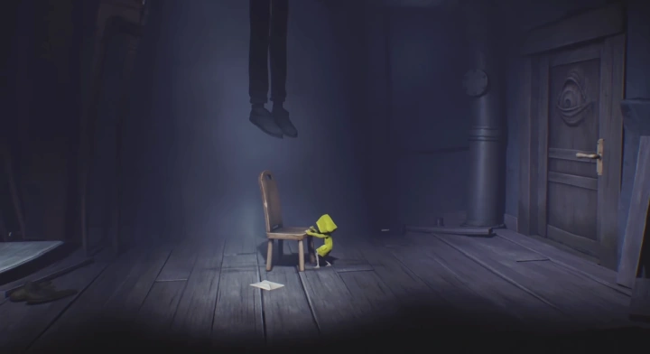 Чтобы пройти в следующую комнату, Шестая должна запрыгнуть на картонную коробку, а затем на стоящую рядом с ней кровать. Подпрыгните и ухватитесь за маленький проём в стене. В комнате с трупом мужчины дверная ручка на двери по соседству будет расположена слишком высоко, чтобы Шестая смогла её достать, поэтому вы должны дотащить стоящий в центре деревянный стул, с помощью которого девочка дотянется до неё. Пройдя дальше, Шестая должна открыть дверь холодильника, который будет задействован как аналог лестницы, и забери есть по нему до верха деревянных конструкций.