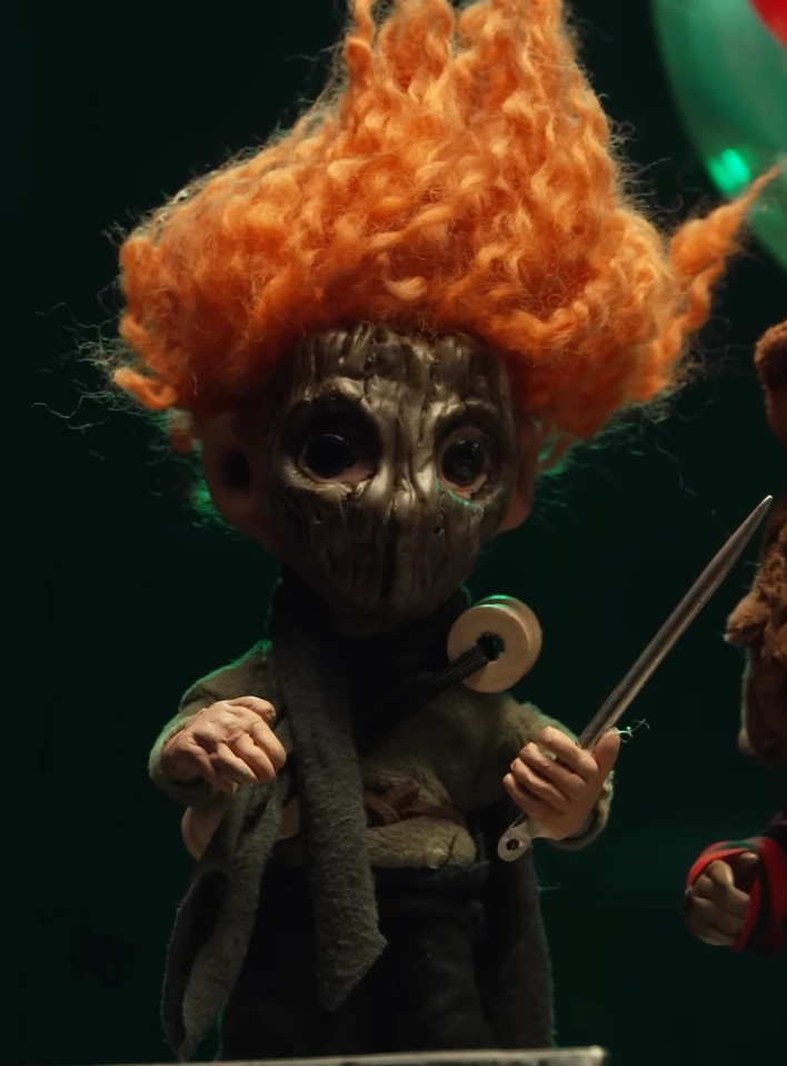Needle is a short boy with frizzy ginger hair and black eyes. He wears a green shirt and cape, along with black pants and a wooden mask to cover his face. He wears string with two spool across his chest and holds a needle in his left hand.