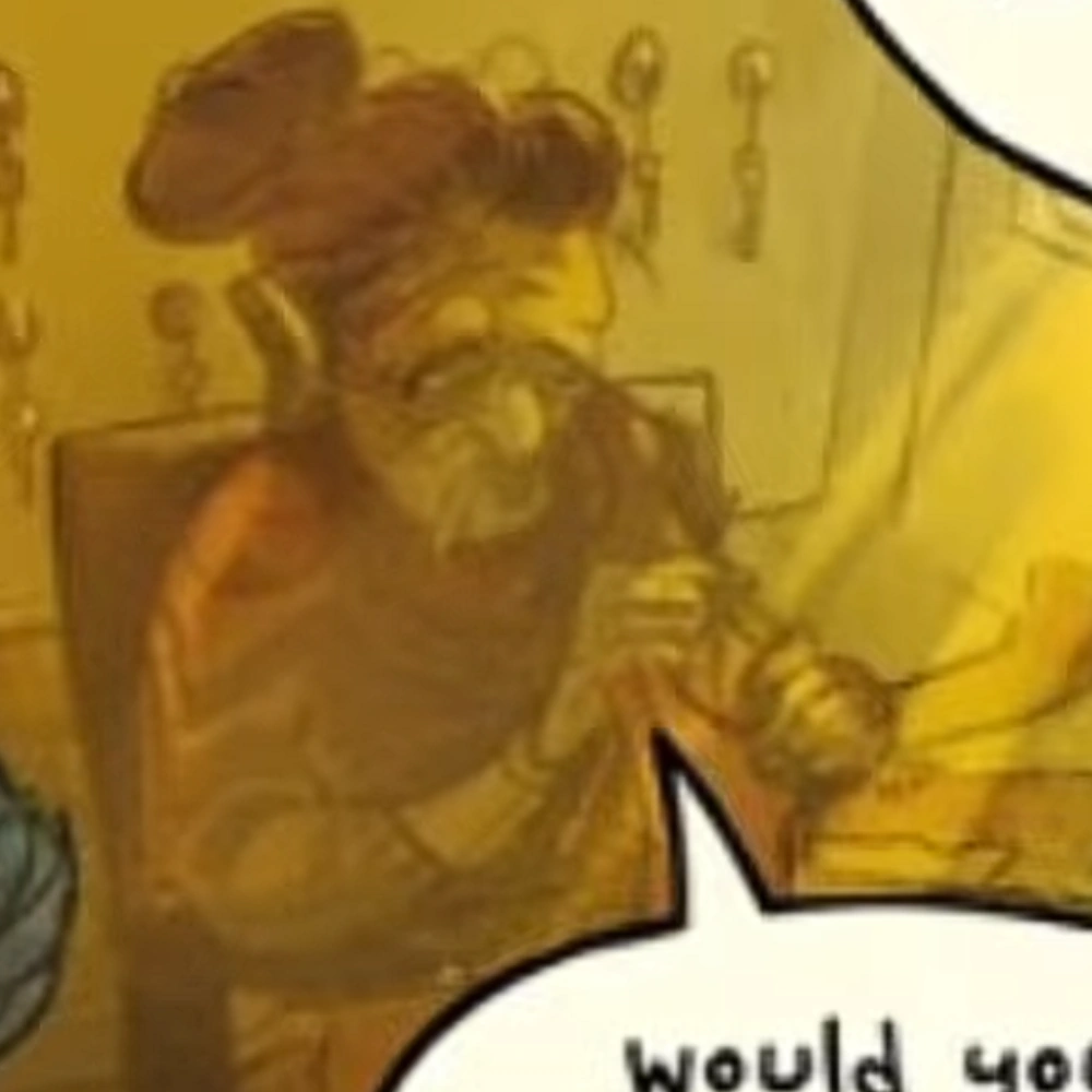 The Landlady is an older woman. Her hair is tied in a bun and she appears to wear an orange sweater.
