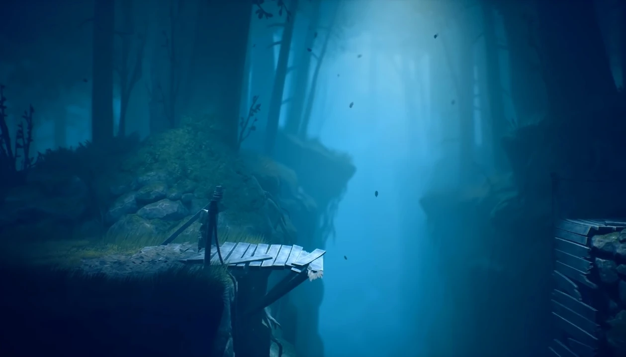 On the way Mono will come across bear traps, past which you can run and climb over a log, behind which there will be two more traps, in one of which a stick is stuck. Pull it out and hit the trap blocking the passage. Proceed, and find and take the second stick to neutralize the traps hidden in the leaves. Next, you will need to neutralize more traps with the help of scattered pine cones. To do this, two or three will be enough for you to throw them at the leaves, activating several traps at once. Climb onto the tree trunk on the wooden planks nailed to it, one of which activates the trap below you, and then jump over to the plain.